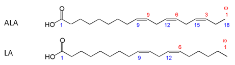 PUFAs are fatty acids that have two or more double bonds in each molecule. There are two types of PUFAs in dietary oil: ω-3 and ω-6. They are distinguished by the position of the first double bond counting from the methyl end of the carbon chain. The ω-3 fatty acids are PUFAs with the first double bond occurs at the third carbon atom from the methyl end of the carbon chain. The ω-6 fatty acids are PUFAs with the first double bond occurs at the sixth carbon atom from the methyl end of the carbon chain (Fig.1).