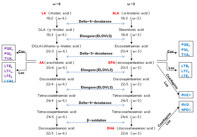 Figure 3. Metabolism of PUFAs in human body. Dietary essential PUFAs LA (ω-6) and ALA (ω-3) are further processed to become longer carbon chain and more double bonds PUFAs by a series of reactions catalyzed by the same set of enzymes desaturase and elongase in endoplasmic reticulum. The final β-oxidation step occurs in peroxisomes.